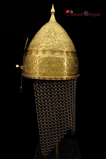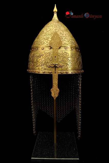 Osmanlı Savaş Miğferi : Karşı Güçten Gelecek Kılıç Mızrak Gürz Gibi Savaş Aletlerinden Savaşçının Baş Kısmına Gelen Saldırıyı Engellemek Ve Savurmak Amaçlı Kullanılan Bir Savunma Aracıdır. Bakır Ve Sarıdan Üretilmektedir. Osmanlı Döneminde Savaşlarda Ve Törenlerde Kullanılan Önemli Bir Zırh Parçasıdır. Bu Ürün Tamamen Aslına Uygun Olarak EL İşçiliği İle Üretilmiştir. Bu ÜrününYapımında Topkapı Sarayı Ve Harbiye Askeri Müzesinde Sergilenen Dönem ''Miğferlerinden'' Yararlanılmıştır.İç Kısmı Gerçek Keçe İle Kaplanmıştır Üzerinde EL Gücü İle Atılan 8 Binden Fazla Çekiç Darbesi Mevcuttur. Üzerindeki İşleme Elmas Uçlu Kalem İle EL İşçiliği İle Yapılmıştır Gerçek Ölçülerine Bağlı Kalınarak Ellerin Bakır Ve Sarı İle Buluşması Sonucunda Şekillenen Bu Ürünü Günümüzde Osmanlı Tarihinin İzlerini Yansıtması Dolayısıyla Ofis Ve Evlerde Dekoratif Olarak Kullanılmaktadır. Mermer Ayaklığı İle Masa Üstünde Sergilenebilir Sevdiklerinize Hediye Edebileceğiniz Anlamlı Ve Prestijli Bir Üründür, Osmanlı Dünyası Tarafından Üretilmiştir. İsteğiniz Üzerine Özel Tasarım Çalışmalar Yapabilmekteyiz ,Özel Tasarım İçin Lütfen Bizim İle İletişme Geçiniz Bu Ürüne Kombin Olarak Kalkan Önermekteyiz Kalkan Kategorisine Buraya Tıklayarak Ulaşabilirsiniz