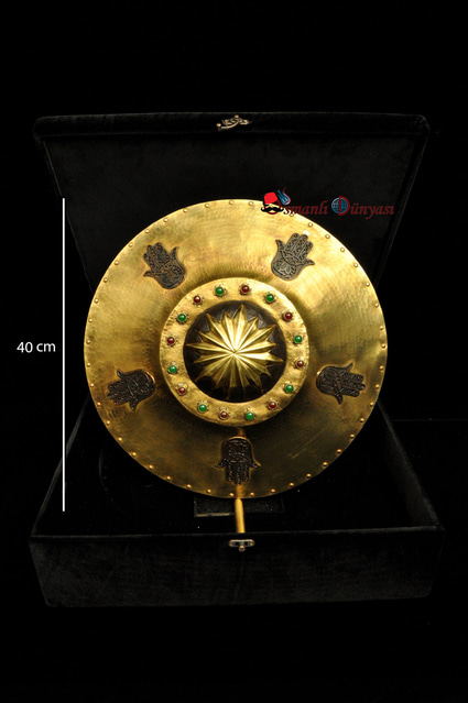Özel Kutusunda Hediyelik Osmanlı Savaş Kalkanı ,Üzerindeki 16 Taşın Her biri Bir Türk Devletini Temsil Etmektedir.Kalkan :Karşı Güç Tarafından Kılıç Mızrak Gürz Gibi Savaş Aletleriyle Savaşçıya Gelen Saldırıyı Engellemek Ve Savurmak Amaçlı Kullanılan Bir Savunma Aracıdır. Bakır Ve Sarıdan Üretilmektedir. Osmanlı Döneminde Savaşlarda Ve Törenlerde Kullanılan Önemli Bir Zırh Parçasıdır. Bu Ürün Tamamen Aslına Uygun Olarak EL İşçiliğ İle Üretilmiştir. Topkapı Sarayı Ve Harbiye Askeri Müzesinde Sergilenen Dönem ''Kalkanlarından'' Yararlanılmıştır. Arka Kısmı Keçe İle Kaplanmıştır .Üzerinde 5 Binden Fazla EL Gücü İle Atılmış Çekiç Darbesi Mevcuttur.Üzerindeki İşleme Elmas Uçlu Kalem İle EL İşçiliği İle Yapılmıştır. Usta Ellerin Bakır Ve Sarı İle Buluşması Sonucunda Şekillenen Bu Ürünü Günümüzde Osmanlı Tarihinin İzlerini Yansıtması Sebebi İle Ofis Ve Evlerde Dekoratif Olarak Kullanılmaktadır. Masa Üstünde Mermer Ayaklığı Üzerinde Veya Arka Kısmında mevcut Olan Kancası İle Duvara Asabilirsiniz, Sevdiklerinize Hediye Edebileceğiniz Anlamlı Ve Prestijli Bir Üründür, Osmanlı Dünyası Tarafından Üretilmiştir İsteğiniz Üzerine Özel Tasarım Çalışmalar Yapabilmekteyiz Özel Tasarım İçin Lütfen Bizim İle İletişme Geçiniz Bu Ürüne Kombin Olarak Miğfer Önermekteyiz Miğfer Kategorisine Buraya Tıklayarak Ulaşabilirsiniz