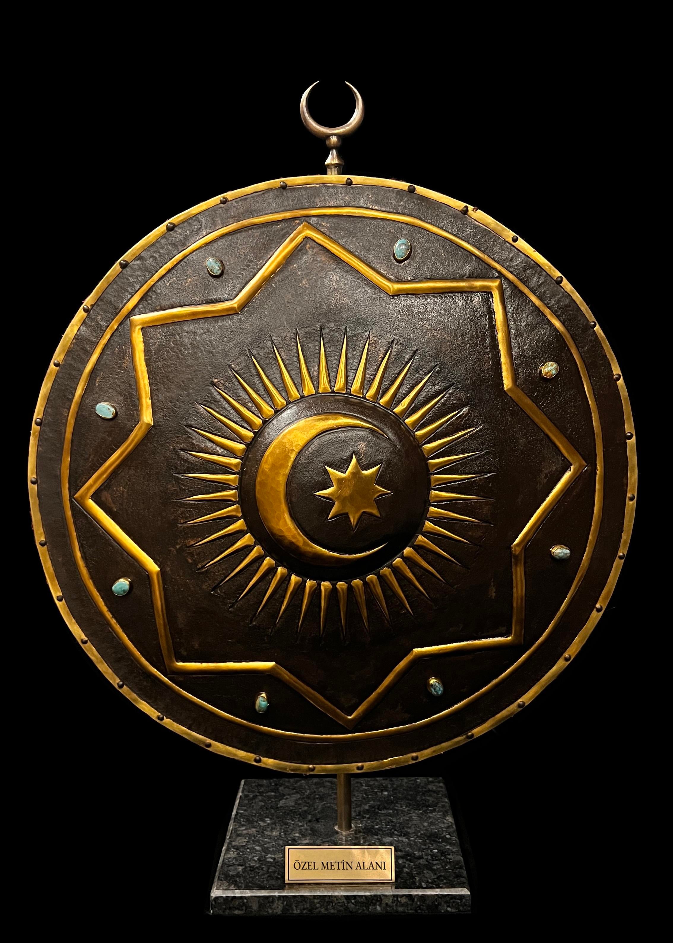 Tamamı el işçiliğiyle hazırlanan bu özel kalkan; altın tonlu kabartmaları, dengeli geometrik yapısı ve ince işçilik detaylarıyla dikkat çeker. Üst kısmında yer alan hilal formu, eserin sembolik değerini tamamlayarak ona anıtsal bir karakter kazandırır.